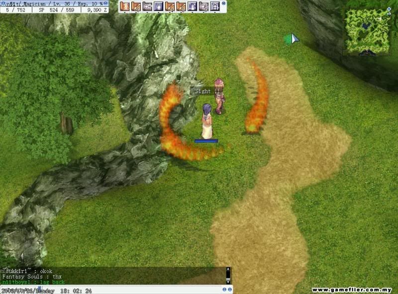 可恶, 这个时候我发觉刚刚竟然有人偷搭我的飞机来古城!..千多zenny的飞机票也..眼睛不由自主的斜视对着那个人物…头带渔夫帽, 黄色半长发女法师…就站在我隔壁..斜视对着他几秒后..还是赶快进去练功好了..(其实是自己的眼睛酸了)..踏进去了蓝色传送圈圈, 心情马上精张起来…这张map就是那时的我最讨厌的地图…虽然过去churhyard只是那短短的几部路..但是那几部路对当时的我来说简直是马拉松的距离那么长…