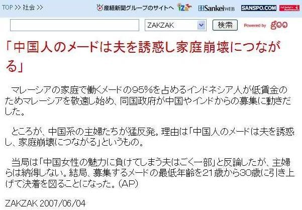 是華人家庭主婦反對進口中國女傭