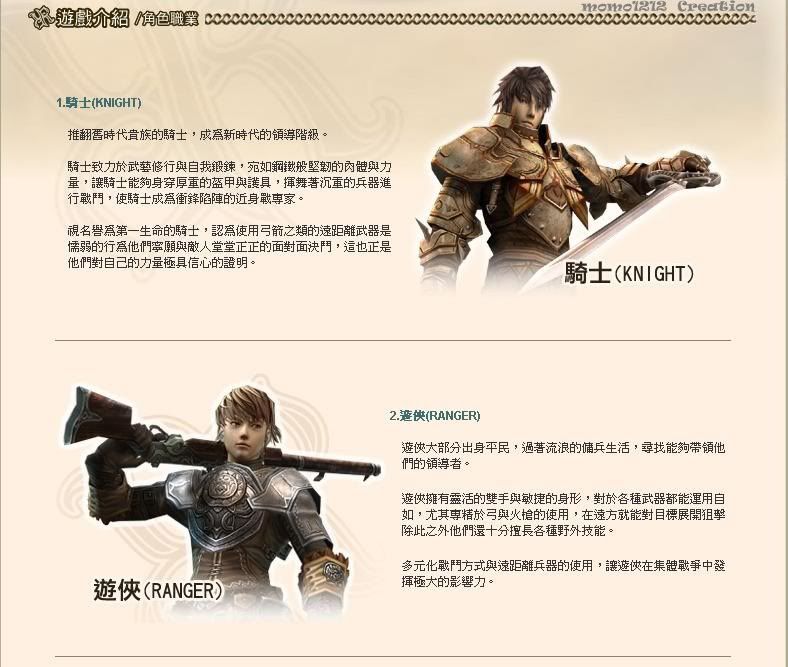 即將於7月26日全面開放,故事從中世紀皇帝集權制度瓦解的戰場展開,玩家可選擇穿重裝備擅長近距離攻擊戰鬥的「騎士」、天性敏捷且善於操作多樣化的武器的「獵人」、利用大自然施展各式魔法力量「精靈」等職業角色,扮演智勇雙全的各地英雄,開創屬於自己的全新局面。而最令玩家期待的,莫過於「不受等級條件限制」的道具裝備系統以及獨特的技能系統,玩家除了可以藉由裝備夢幻道具來提升自己的能力之外,每個公會都擁有各自的公會樹狀技能,甚至每個城堡和據點也擁有屬於各自獨特的技能。