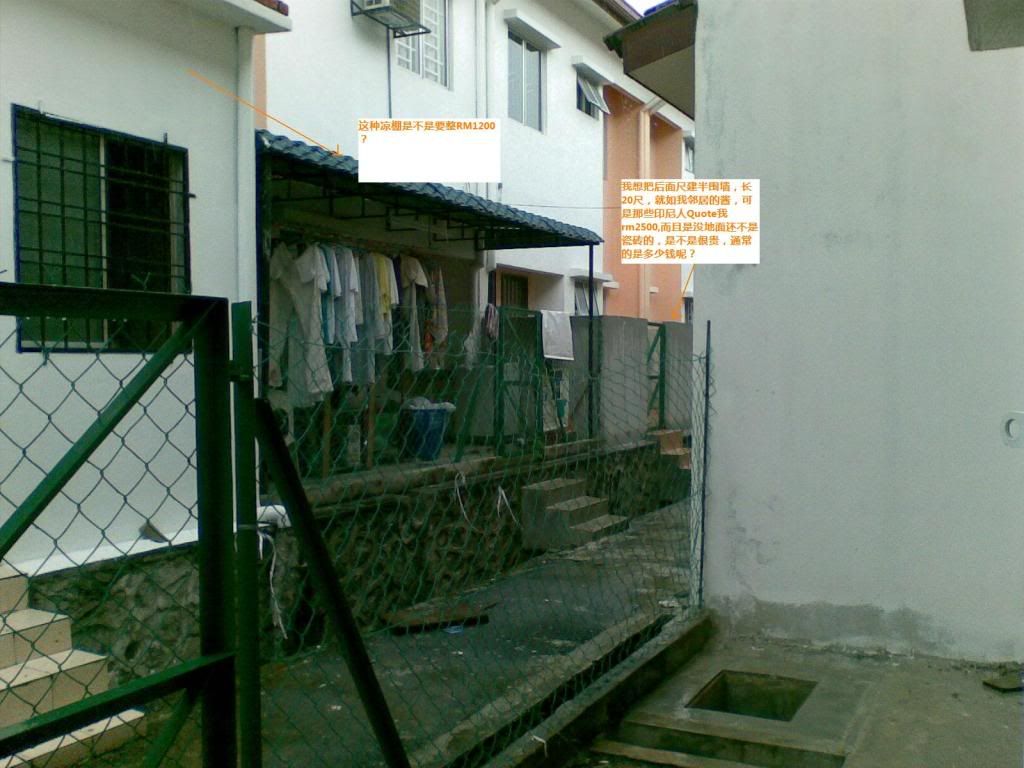 1.我想把后面尺建半围墙,长20尺,就如我邻居的酱,可是那些印尼人Quote我rm2500,而且是没地面还不是瓷砖的,是不是很贵,通常的是多少钱呢?可以介绍吗?
