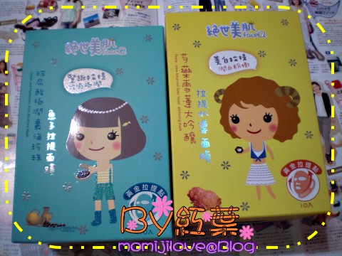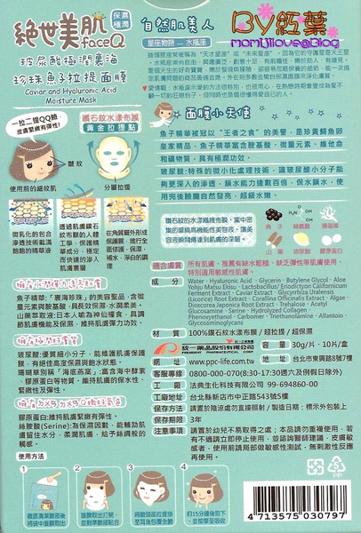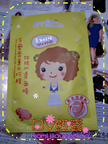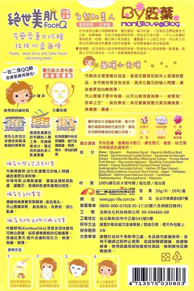 這次的絕世美肌真是有備而來,不僅面膜名稱取得華麗不凡(?),包裝更是吸引人的可愛,連背後產品說明都很熱鬧,整個感覺好豐富不買很對不起自己的說。XP