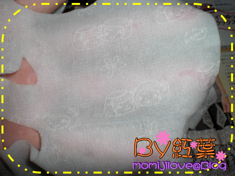 打開拉提面後我發現個有趣的地方,它的面膜紙上竟然有圖案!就是這次推出的兩款拉提面膜插畫娃娃的大頭,還有小花和櫻桃相間,沒想到除了包裝,連面膜布上都叫人驚喜,真是太可愛啦!!!