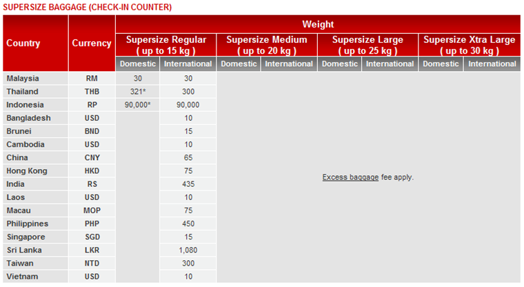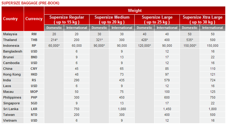 寄艙行李有15KG,20KG,25KG三种,在起飞时间4小时前你可以随时登陆亚航网站增加行李重量 |