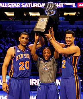 最后一支参赛球队纽约尼克斯派出了他们的二年级球员兰德里-菲尔德斯,纽约自由队的卡比-庞德克斯特,以及现在已经升任尼克斯管理层的前“中投王”阿伦-休斯顿。此前,曾有消息显示,近期火热的林书豪(微博)很有可能将会代表尼克斯出征此次投篮之星比赛,不过因为入选了新秀赛,林书豪最终没能成行此次投篮之星大赛。
