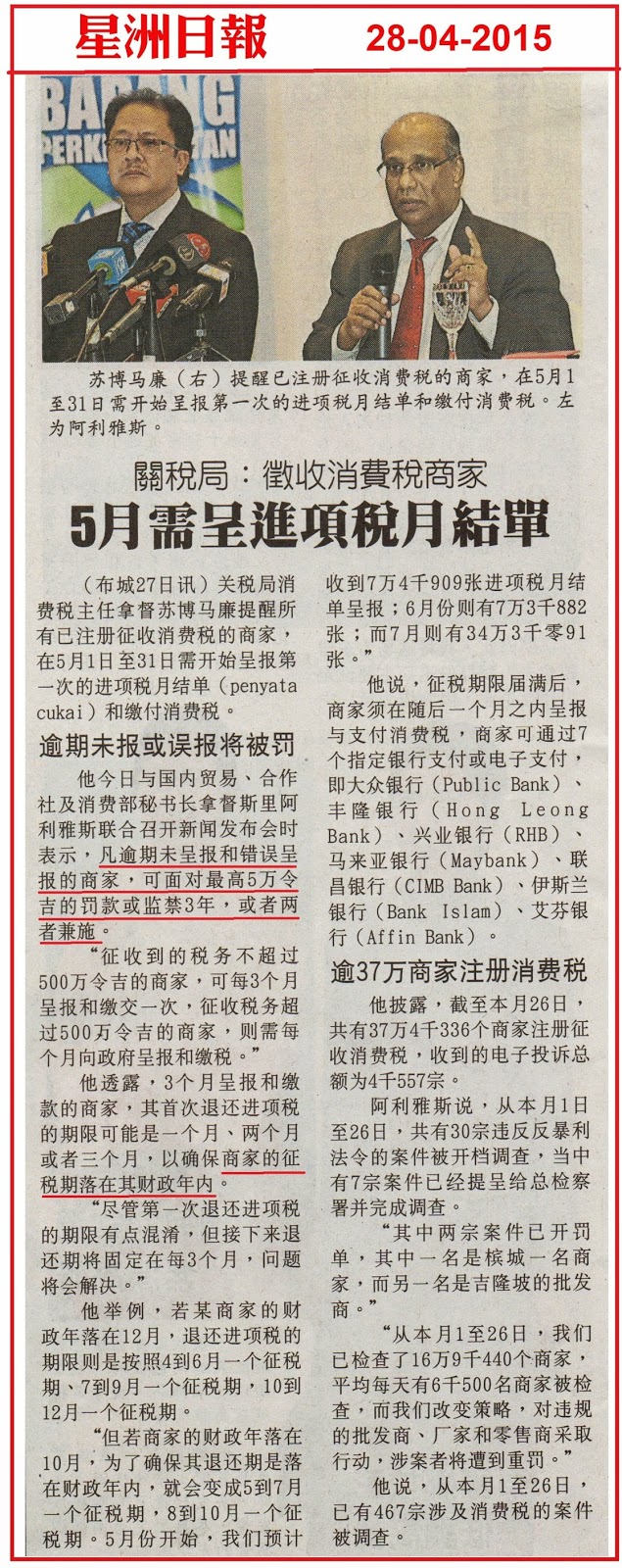 (布城27日訊)關稅局消費稅主任拿督蘇博馬廉提醒所有已註冊徵收消費稅的商家,在5月1日至31日需開始呈報第一次的進項稅月結單(penyata cukai)和繳付消費稅。