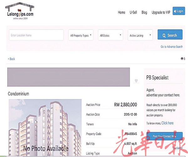 他说,前者原本叫价330万令吉,但首次拍卖不成功,所以拍卖价格再减掉10%,剩下280万令吉,等待即将来临的拍卖。此外,根据记者在拍卖网上搜寻,在今年8月份出现拍卖价高达180万令吉的丹绒武雅区高级公寓、81万令吉的靠近槟城大桥高级公寓,以及145万令吉市中心高级公寓。