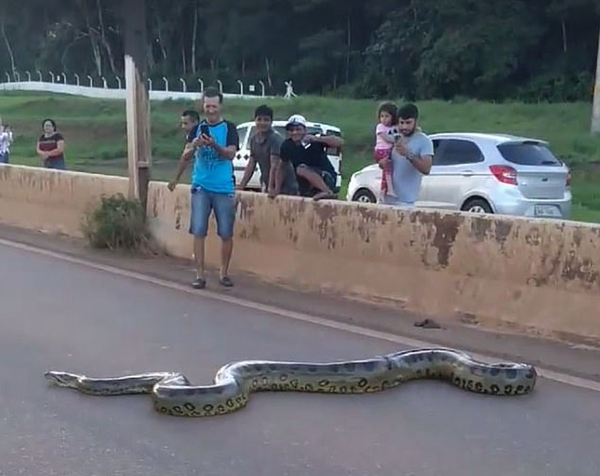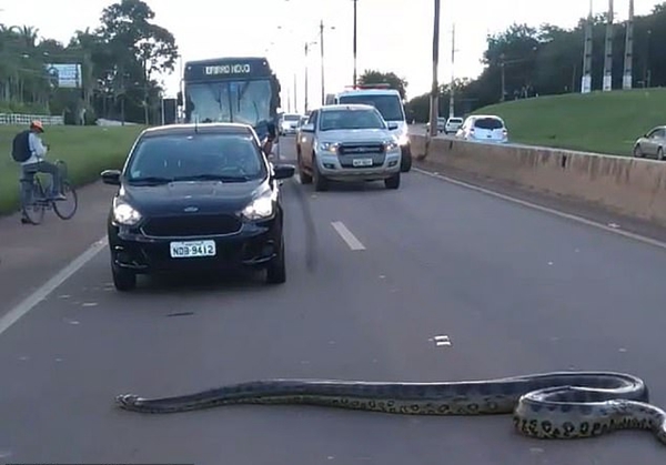事件的发生地在巴西西北部城市韦柳港(Porto Velho)。这段视频很快在网上流传开来,视频显示一条3米多长的巨蟒正在横穿公路。由于这是一条多车道的公路,蟒蛇需要爬越路中间的路障。蟒蛇不紧不慢地在公路上蜿蜒爬行,导致交通一度中断。