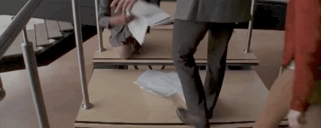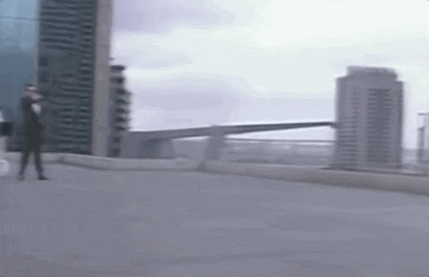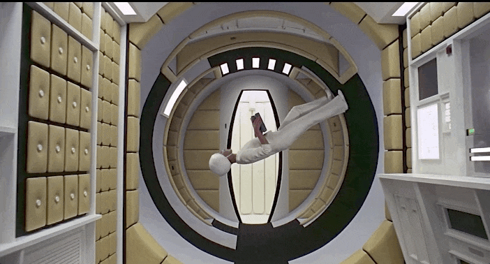 ▲ 整个场景都在圆轴转动 在《2001 太空漫游》、《星际穿越》等科幻作品中,利用将相机与场景一起转动的手法拍摄出主角在太空、异世界漫步的画面,观众本能地会以背景为固定参照物,看到角色反地心引力运动的一幕。