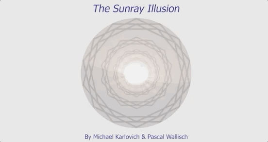 这是由于当多边形相交时,我们的大脑会不自觉的将交点连接起来,从而出现特别亮的「光线」错觉,当多边形转动一致时,「光线」错觉也随之消失。