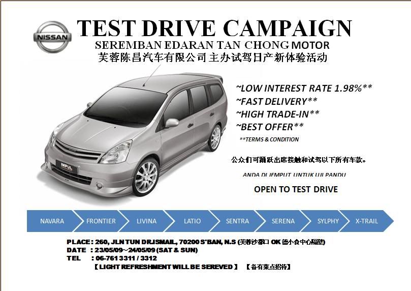 公众们可踊跃出席,当天可试驾的车款有NAVARA, SENTRA, GRAND LIVINA, SYLPHY, SERENA, FRONTIER, LATIO和 X-TRAIL。有兴趣的公众可到芙蓉陈昌陈列室接触和试驾NISSAN上述车款。