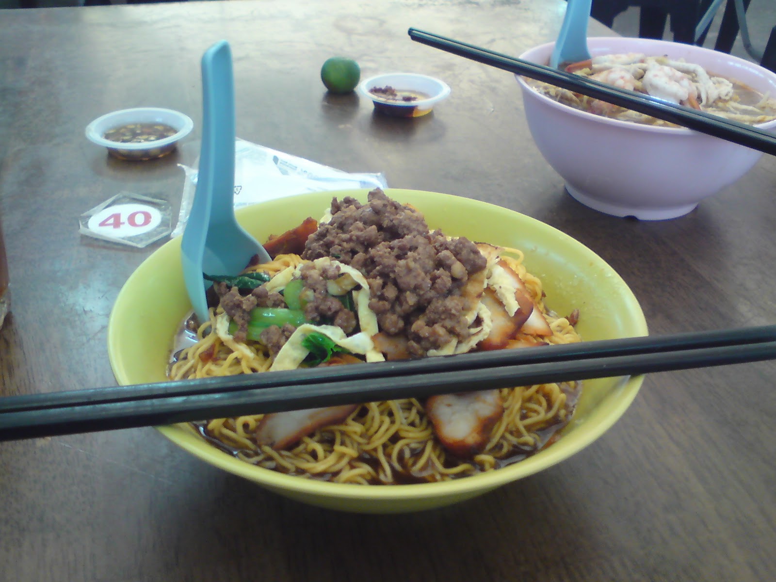 Sarawak Laksa, 顾名思义,就是 Sarawak style 的Laksa,味道跟西马的不同,有甚么不同呢 ? 呃。。,说不出那里不同,只可以说,用的材料和煮法不同吧 ! 还有,它椰浆味很浓 (当然,一些奸商下手不重,淡了些。。。),和带有少许虾酱的味道。。好吃不好吃呢,那就看各人的喜好了,我就说好吃啦。。。尤其是 Laksa 面。。。其实原来的配搭是 Laksa + 米粉(米粉要是那种粗于普通米粉但又细过濑粉的),但个人就比较喜欢 Laksa + 面,而这面呢,就一定要是 Kampua 的面,我还是不能接受搭黄面的。。。。。