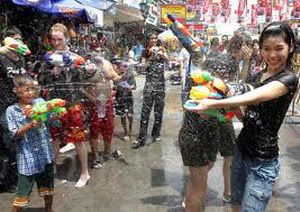 泰国的泼水节,有称“宋干节”。宋干是梵文,意为“太阳运行到白羊座,既新的太阳年开始”。泼水节共有3天,是泰国一年中最热的时候。节日前要清扫家内外,焚烧旧衣服,以避晦气。节日当天要到寺庙中堆沙塔,插彩旗献花,祈求五谷丰登。晚上将浸有花瓣的香水洒在长辈的手臂上、背上,表示对长辈的美好祝福;此后长辈再将水淋在晚辈的头上,表示来自长辈的赐福。