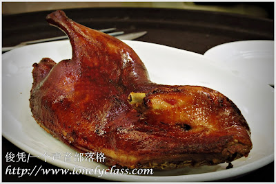 看看那烤得金黄色的鸭皮,皮下有着厚厚的脂肪,吃在口里“卡兹卡兹”的声音,啊!赞!!