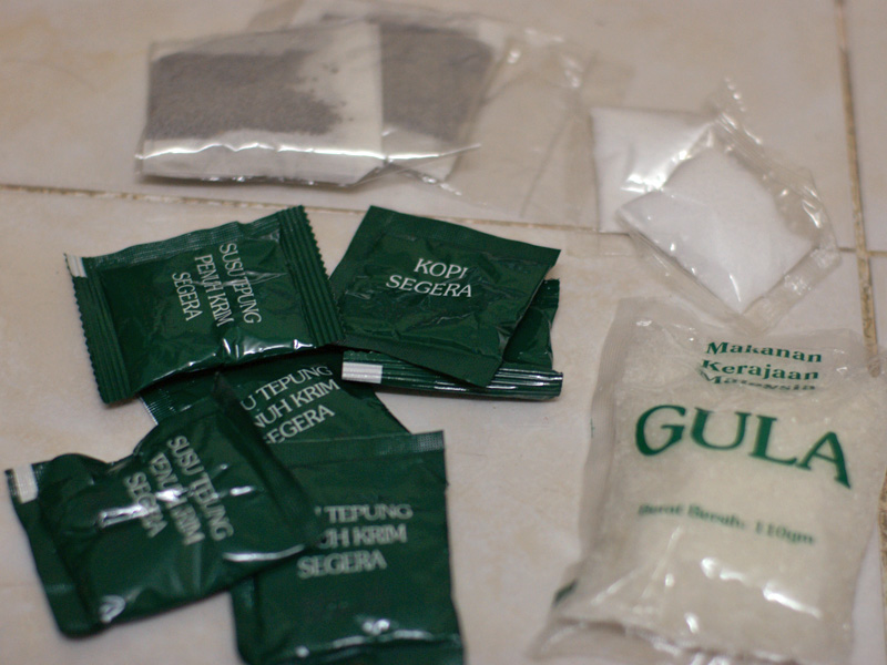 3。2 包 2 克的即溶咖啡,6 包茶包,4 包 2 克全脂奶粉,2 包 110 克白糖,1 包 32 克食盐。