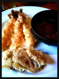 我喜歡這個. 天婦羅部份有四種,蓮藕(好吃, 脆脆的),番薯有兩種, 比較硬以及比較軟的, 比較硬的爽口, 軟的很甜, 還有甜蝦, 熱騰騰的, 再加上我放了超多蘿蔔泥的醬汁, 幸福啊 ~~ (≧◇≦)