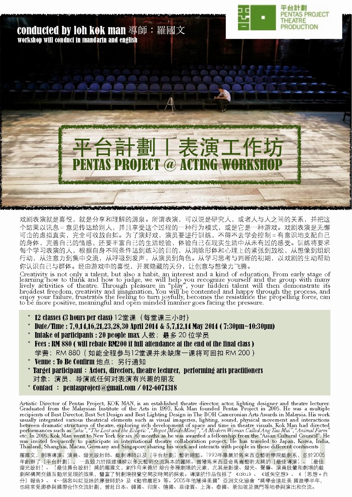 工作坊导师 : 罗国文 羅國文,劇場導演、演員、燈光設計師、戲劇導師以及[平台計劃]藝術總監。1993年畢業於馬來西亞藝術學院戲劇系,並於2005年創辦了[平台計劃], 一直致力於搭建橋樑以多元藝術交流為本的團隊。曾獲馬來西亞金馬崙藝術大獎的[最佳導演]、[最佳燈光設計]、[最佳舞台設計]獎的羅國文,創作向來善於 綜合多種劇場的元素,尤其是影像、燈光、聲響、演員肢體和劇場的戲劇架構間交錯互動所呈現的效果,豐富了對劇場視覺空間及時間的探索。導演的作品包括了 《aku》、《城失空想》、《[思想+自分]報告》、《一個名叫紅豆妹的摩登師奶》及《動物農莊》等。2005年他獲得美國”亞洲文化協會“獎學金遠赴美 國遊學半年,也經常受邀參與國際合作交流計劃,曾赴日本、韓國、印度、德國、菲律賓、上海、泰國、新加坡及澳門等地參與演出和交流。