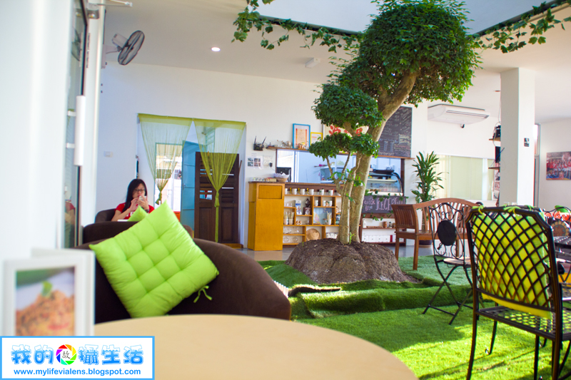 咖啡馆中间铺上了绿色草地地毯,把整个环境弄得像个花园似的。 在员工还没告诉我之前,我一直以为这棵树是假的呢!万万没想到在咖啡馆里竟然有一颗活生生的小树,好特别啊!既然是活生生的树,所以是需要阳光的。因此,在树的正上方是个透明的金字塔玻璃窗,好让阳光直射在树上。