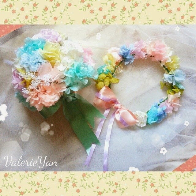 而花环我是想到过后的婚礼是花园式的,所以就顺便制作了花环,以便注册时拍照用,而且日后的花园婚礼可用上,花环加上头纱,超美超浪漫的~
