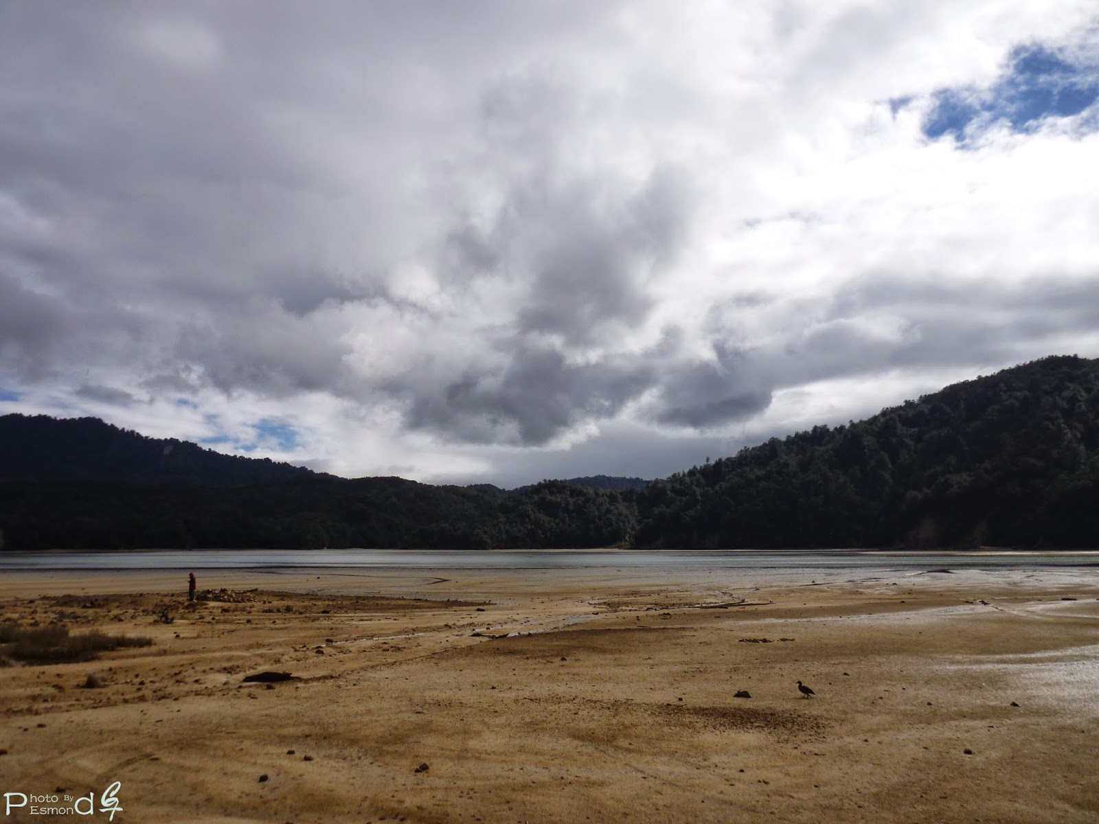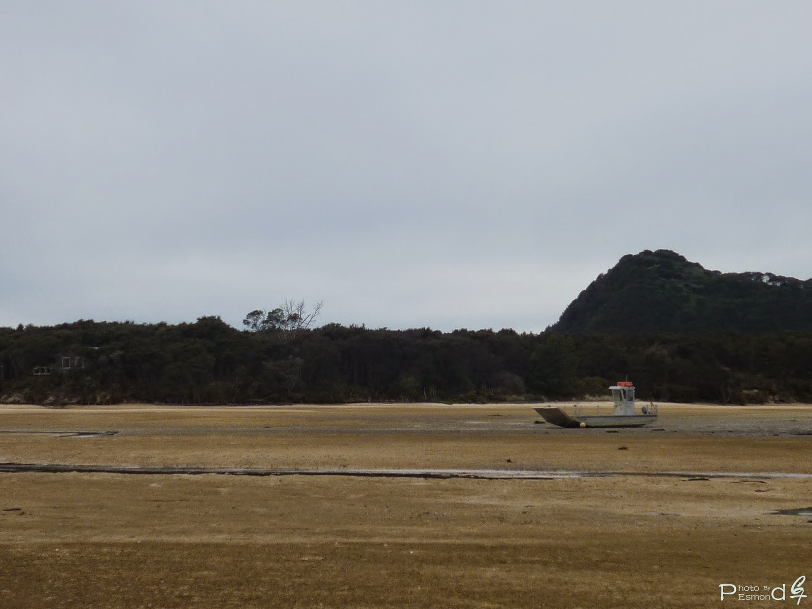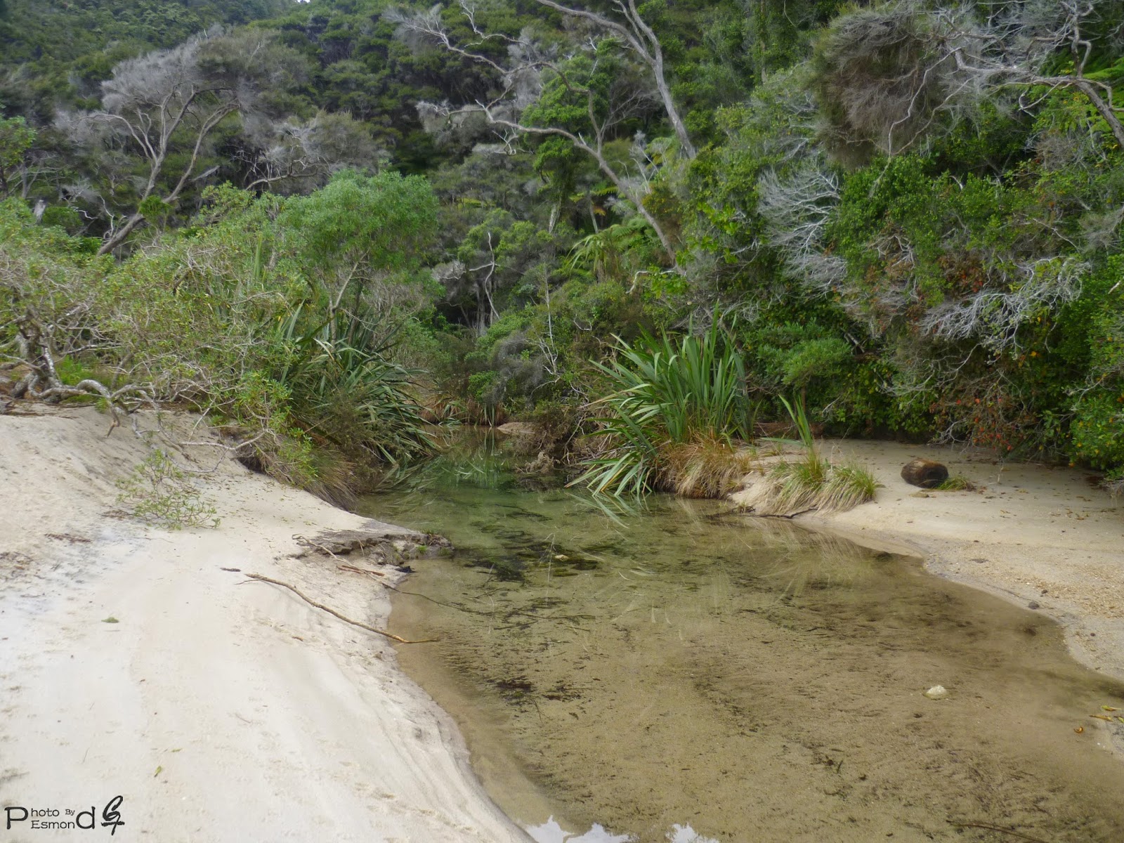 从Awaroa往前去Whariwharangi Bay第一个面对的就是眼前这一段路。。。这段路其实是一条小河,就算在最低潮的时候也不可能完全可以不沾水的越过。这段步道可以在低潮的前1小时30分钟或后2小时安全越过,其他的时段是不允许冒险越过。这一天的最低潮大概是下午2时30分钟,也就是说我最早可以开始健行是下午1时,然后再花5个小时多去到今晚的住宿,预计抵达Whariwharangi Bay接近下午7时了。。。现在大家应该明白为什么我需要把全部行程提早了吧。。。