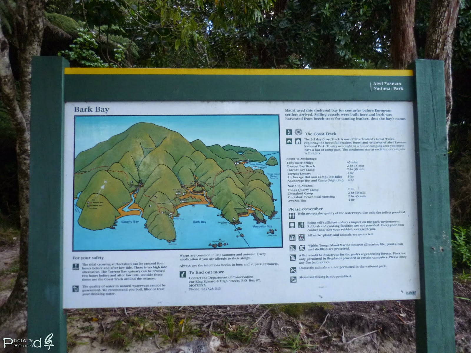 来到Marahau这里,稍微的休整一下,我就开始健行。第一天的行程原本应该是从Marahau去到Anchorage的Hut,12.4公里,预计费时4小时,但是当时的Anchorage Hut却关闭维修,这就导致了我不能在这间Hut过夜。我在没办法的情况下,唯有选择直接冲去接下来的Hut--位于Bark Bay的Hut。从Anchorage去到Bark Bay,距离11.5公里,预计费时4小时。那么一说,我第一天从Marahau去到Bark Bay就是全程23.9公里,预计费时8小时。虽然之前走Queen Charlotte Track时有走过一天24.5公里的经历,但当时并不需要背着大大的背包啊!!!不管了,总之兵来将挡水来土掩,管他三七二十一,我就专心的赶路吧!!!