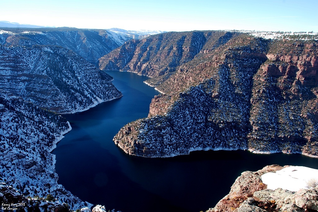后来我往Flaming Gorge Dam的方向开去,途中也有几个观景区,拍了不少照片。其中Red Canyon最令人印象深刻。我需要离开公路驶到林子旁的小路一路开数公里才抵达Red Canyon,这里我看见有钓鱼的指示牌,应该是冰上钓鱼活动的地方。Red Canyon是个峡谷,峡谷两旁都是红色岩墙,只是冬天都被点点雪迹掩盖了红色。下边是缓缓流动仿佛静止的Green River。Red Canyon高约1700尺,宽约4000尺,景色宜人。我小心翼翼地走过防护栏旁厚厚的积雪,欣赏着弯弯的峡谷,慨叹自然之美。想到开车越过小路到这个地方,有种寻获宝藏的成就感。