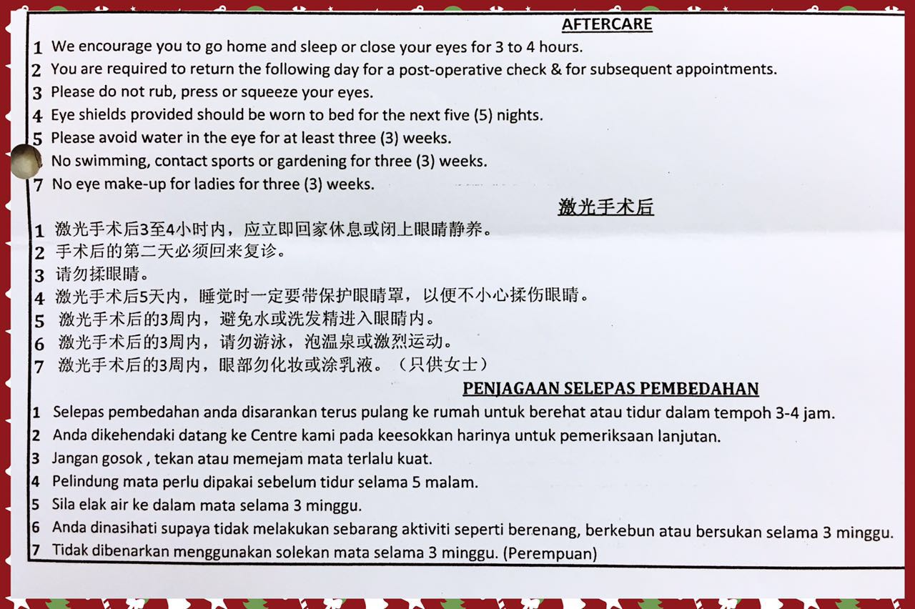 正式轮到我了,躺在手术床上然后医生开始叫我放松,但就是紧张到不行!然后就有一个机器在我的眼睛上方,医生用那台机器帮我放上Ring,主要确保眼睛不会闭上和眨眼,然后镭射手术进行了,首先会将眼睛外面那层(貌似眼膜)开一半,然后开始镭射,整个镭射的过程都会看不到(不用紧张!)只看到红色蓝色青色模模糊糊的光线,然后确保你的focus在一个定点,医生会指导你,会听到机器吱吱吱的声音和微微的烧焦味,整个过程大约10分钟(要看你何不合作咯,不合作就是自己受苦),结束后将眼膜盖上,滴上药水,完成。
