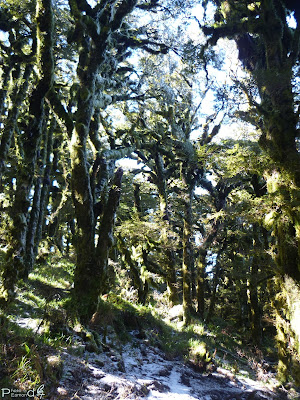 走到中午时分时,一直乌云满天的天空终于回复纽西兰最漂亮的颜色--一片蓝蓝色的天空!!!看着蓝蓝色的天空,心情顿时也好了不少。由于天气转晴,树枝上的积雪和冰就融化的更快,每当走过一片类似的树林,我就需要冒着水滴前进,就好像在雨天赶路似的。。。纳闷啊。。。