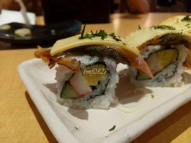 我们也点了母亲大人受吸引的 Unagi Summer Roll。烤过的鳗鱼片配上芝士和饭卷,味道不俗。这样的搭配很合适,芝士丰富了整道 maki 的味道。