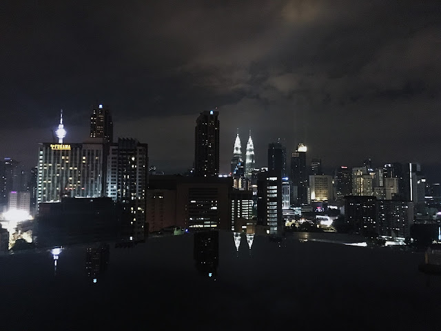 吃过晚餐,咱们上顶楼吹吹风。旁晚下过了雨,特别凉快。顶楼的无边游泳池,前方没有任何高楼大厦的阻挡,可眺望KL全景风光。不必去Fine Dining都可享受这夜景,我的生日还有什么不满足呢?