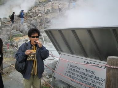 我们一边搭巴士到桃。。。站搭缆车到大涌谷,爬了好一段路才看到那“一团烟”和吃了传说中的“黑玉子”!500YEN六粒,其实就是鸡蛋而已嘛!只是外壳黑黑的。(安安说是硫簧所产生的化学作用)撒点盐巴还很不错吃。日本人真有生意头脑。吃完了,我们也不能呆太久,有告示牌说硫磺对眼睛有点影响,我们吃完,拍了拍照就下山了。