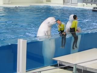 我最喜欢的是”白海豚” 它们配合浪漫的音乐跳着舞,很有气氛! 表演过后,我们就去看那大名鼎鼎的全日本三层楼高的:水族馆” ,安安很喜欢日本的水族馆,他说日本人将水族馆设计到很好,让人感觉和缸内的水族很接近,没有距离感.
