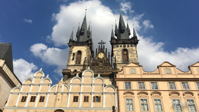 这显眼的黑色尖塔建筑便是 泰恩教堂 Tyn Church ,提恩教堂是旧城广场里最古老的建筑,外表黑压压宛如童话世界的魔鬼城堡,因此有魔鬼教堂之称。