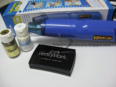 我是用这罐gold embossing powder. heat up后会有亮亮的感觉. 我看金色最适合做贺年卡, 或结婚卡, 华人都爱金+红....... |