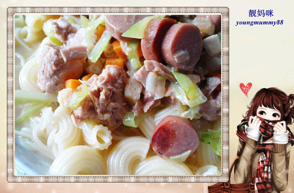 材料:大葱切丁,包菜切丝,红萝卜切丁,香肠切片,油浸tuna一罐,cheese3片(夹面包的cheese),蘑菇汤料2包 或 1罐罐头意大利面白酱
