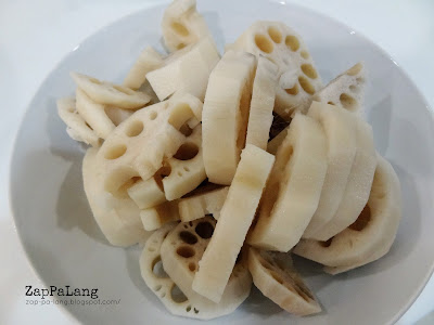 2. 莲藕去皮后切成片备用。