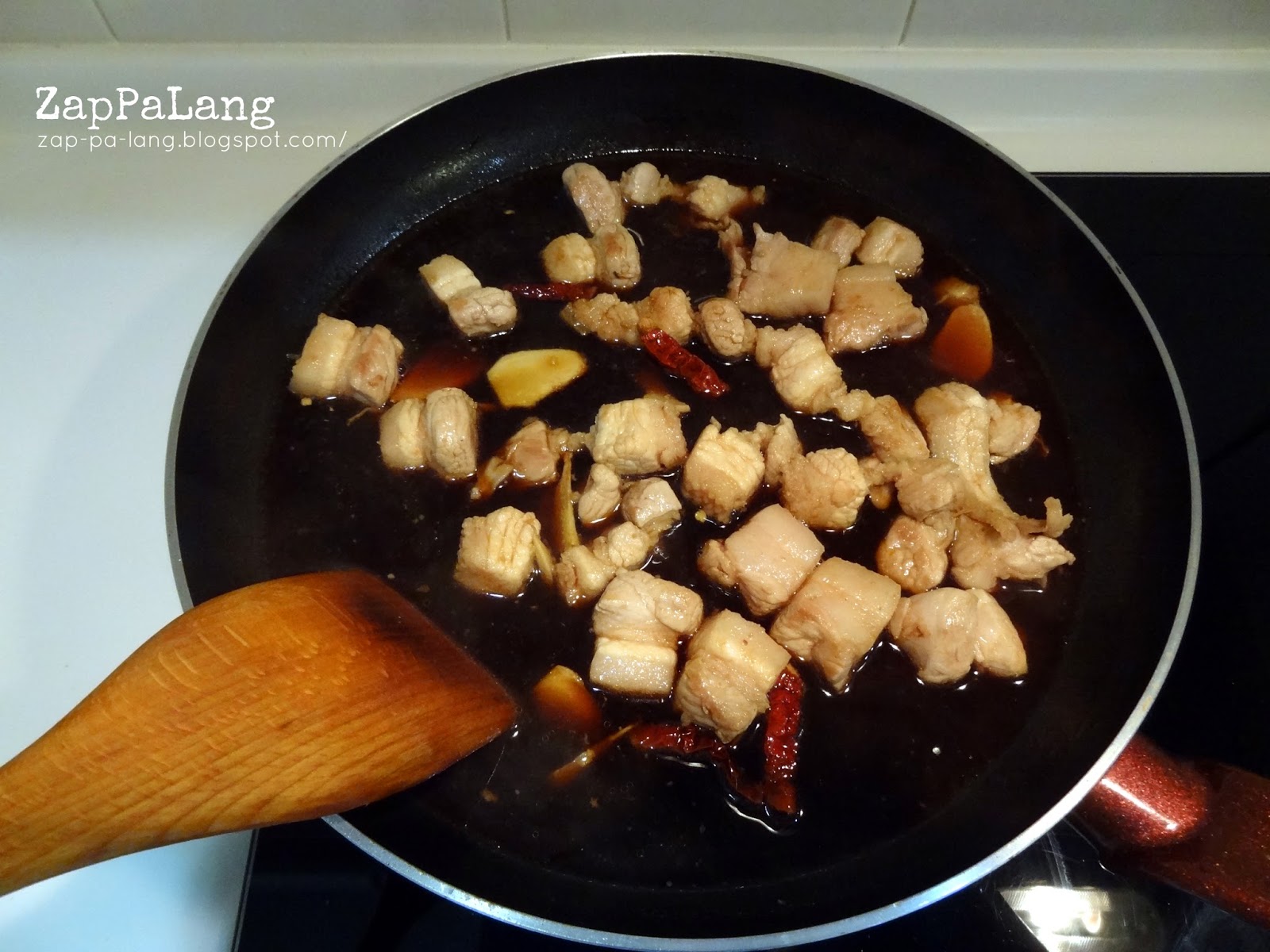 4. 倒入汽水,然后加入辣椒干、肉桂、八角、酱油和黑酱油,以小火焖大约半小时。