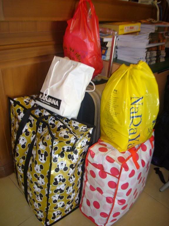 这些袋子是我的旅游购物的武器。红色圆点的是从台湾买的哦。去了台湾还有曼谷两次呢。