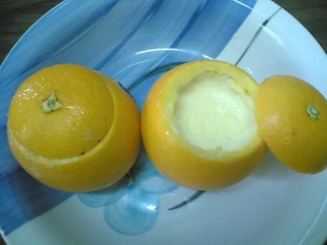 食譜是出自低糖甜點這本書,因為實在是太可愛了,而且配方又簡單,所以就做看看,不過在挖柳橙果肉的部分最辛苦,我是做12個柳橙,挖完的時候手都酸了><,又不能太大力,怕挖破杯身.不過看到成品的時候真的很有成就感哦^^.送人也很好看呢~吃的時候又有濃濃的奶香味,因為裡面有放動物鮮奶油,所以就很香.這個成品做好時,連我們家那個不愛吃cake的肥佬也吃了2個呵呵~~ |
