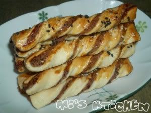 3、最後桿成長44公分x寬27公分,其中一邊均勻撲上紅豆沙,對折切成適當的長條狀,左右扭轉,刷上蛋黃液撒芝麻,以200度c/160度c烘烤20~25分鐘。