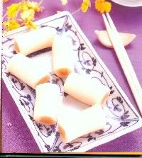 ( 1 ) 將皮料中的糯米粉, 粟粉, 砂糖及油拂勻, 加清水3兩攪勻, 蒸10分鐘, 待冷卻後切成粒狀.