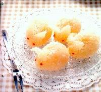 ( 3 ) 按扁1粒糯米皮, 放入1粒餡, 搓勻, 捏成頭尖尾圓; 近頭部用剪刀剪成耳朵形狀, 用椰絲沾滿糯米皮, 避免黏手; 最好用車厘子做眼睛, 即成1隻兔子狀的糯米?. 如是者做作多隻兔仔, 即可上碟. |