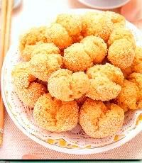 ( 3 ) 燒滾油, 倒入混好芝麻的麵粉粒, 炸約10分鐘至金黃色, 即可撈起, 上碟. |