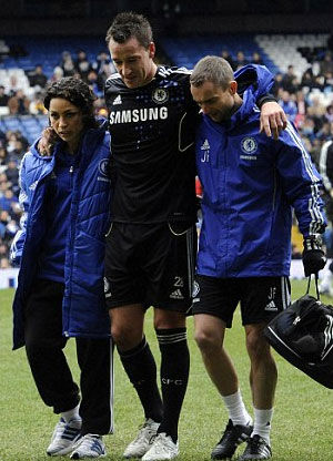 切尔西(微博)即将在北京时间周五凌晨挑战目前排名第3的热刺,但是在当地时间周一的训练中却遭遇了“惊魂一刻”,蓝军后防核心、队长特里在训练中受伤,不得不在队医的搀扶下一拐一瘸地离开训练场。