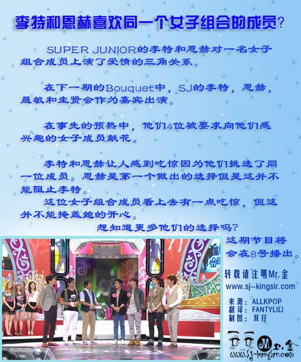 On August 8th’s airing of MBC Bouquet, a segment was dedicated for four SuJu members (Sungmin, Leeteuk, Eunhyuk, and Kyuhyun). They were given a chance to hand a bouquet of flowers to a member of a girl group they personally are interested in.