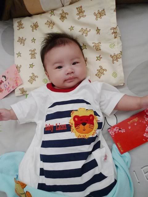 今天第一次睡摇篮..希望可以圆回来...新年给亲戚朋友摸到他的头, 都说作么没睡摇篮.. |