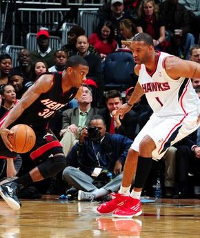 老鹰赢得了跳球,第一次进攻就由约什-史密斯跳投命中。波什上篮得手还以颜色,但是接下来威廉姆斯连得5分,老鹰以7-2领先。热火的主要进攻点依然是波什,他连续两次完成抢断并且上篮命中,带领着热火还了一个8-0的小高潮实现了反超。老鹰换上了麦蒂,他先是上篮拿下2分帮助老鹰以13-12反超,随后又利用广阔的视野连续送出两次传球。不过哈斯勒姆连得4分,热火还是以22-19领先老鹰队结束了首节。