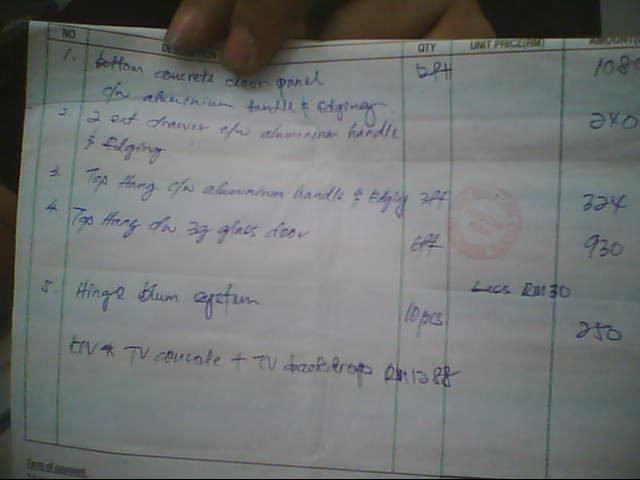 我的给我朋友做的,但他事先声明最快要1个月半。 他说还有其他的工要赶,我的只放2-3个人来做。 我这里的condo 拜6(9.30AM-1.00PM)礼拜是不可以开工的,平时天只可以9.30-5.00 |