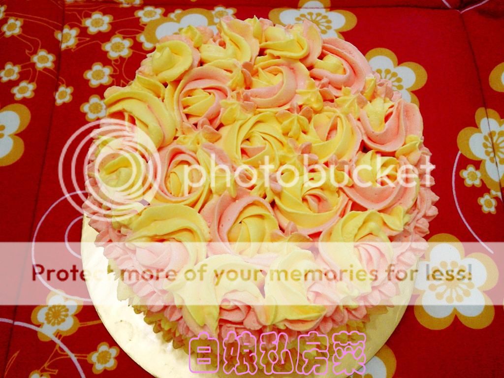 当我说送给小姑蛋糕时候,小姑的小姑也说喜欢吃鲜奶油蛋糕。。说要跟我买。。所以先送她一粒小的6寸的试吃版。。也顺便打广告一下 深浅色的配搭我更加满意!!!!娇媚艳丽的黄玫瑰。。。好像一束bouquet呢  |