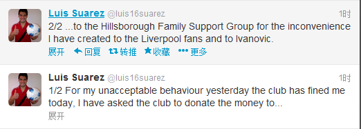 既赛后第一时间向伊万诺维奇道歉后,苏亚雷斯在今天再次道歉,并且表示自己接受利物浦队内罚款,他在自己的推特上写道:“因为我昨天令人无法接受的行为,俱乐部今天已经处罚了我,我给利物浦球迷以及伊万诺维奇带来了不好的影响,我已经要求俱乐部将我的罚款捐给希斯堡惨案遇难者基金会。”