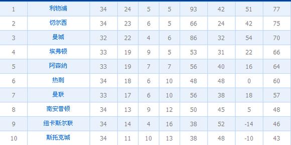 截至北京时间4月14日,2013-14赛季英超第34轮结束了8场较量,除了阿森纳和曼联的比赛外,其他全部比赛结束。本轮在一场天王山战役中,利物浦3-2击败曼城。切尔西也一场关键战役中1-0击败斯旺西,结束客场3连败,以2分优势紧随利物浦,领先曼城5分。不过,蓝月亮少赛2场仍然有反超切尔西的可能。而在欧冠资格赛席位的争夺中,埃弗顿抢到了阿森纳的前面,两队同样只赛33轮,目前太妃糖积分比枪手高2分。
